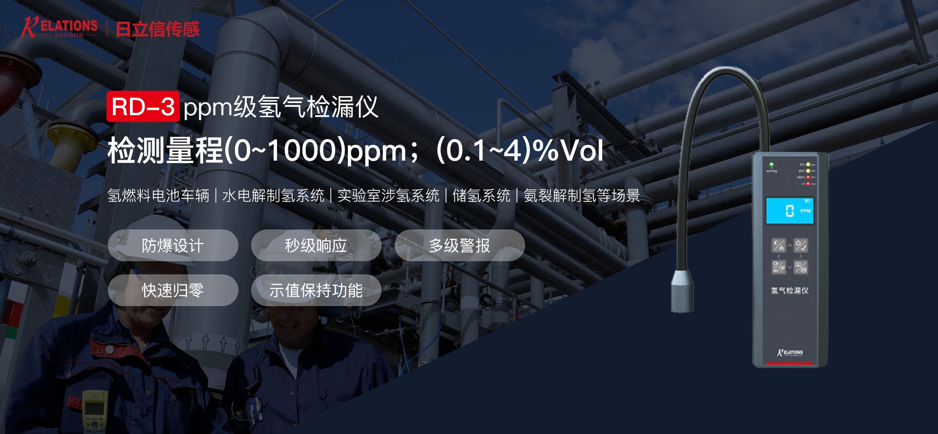 電解水、天然氣、氫分裂制氫,輸氫管道、氫氣置換,制氫站、加氫機、卸氣柱、撬裝站、氫燃料電池汽車及系統(tǒng)測試臺架、熱電聯(lián)供、氫滲氫實驗室、涉氫生產(chǎn)廠房、氫氣氣瓶間等場合中的氫氣濃度、純度、濕度檢測。